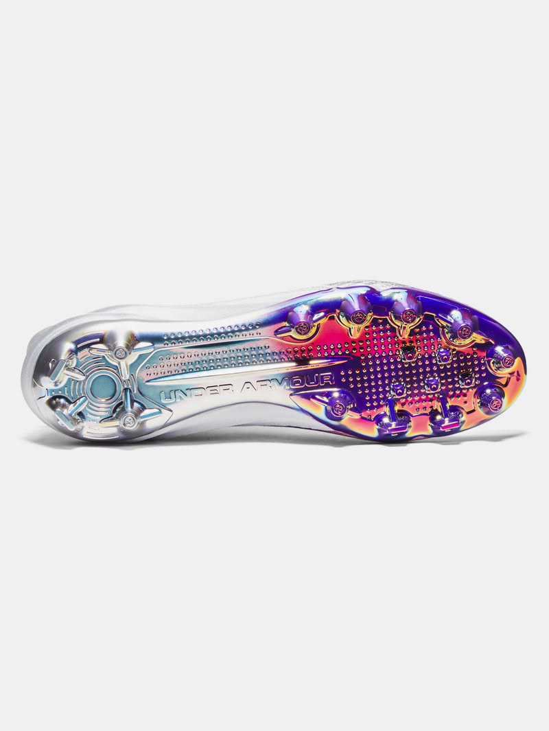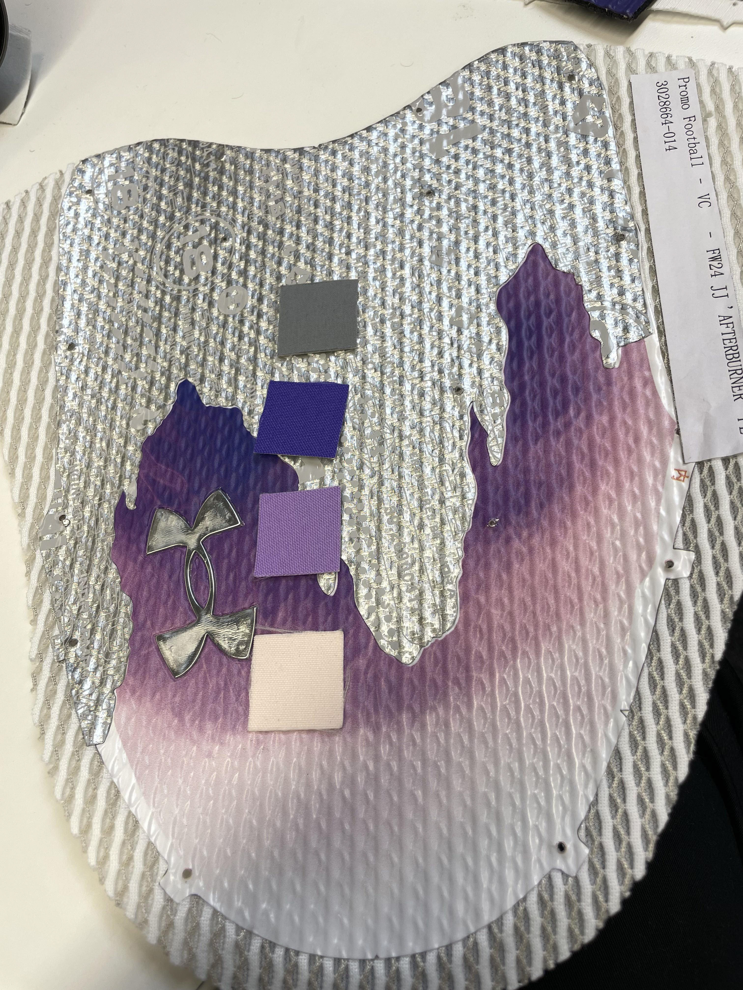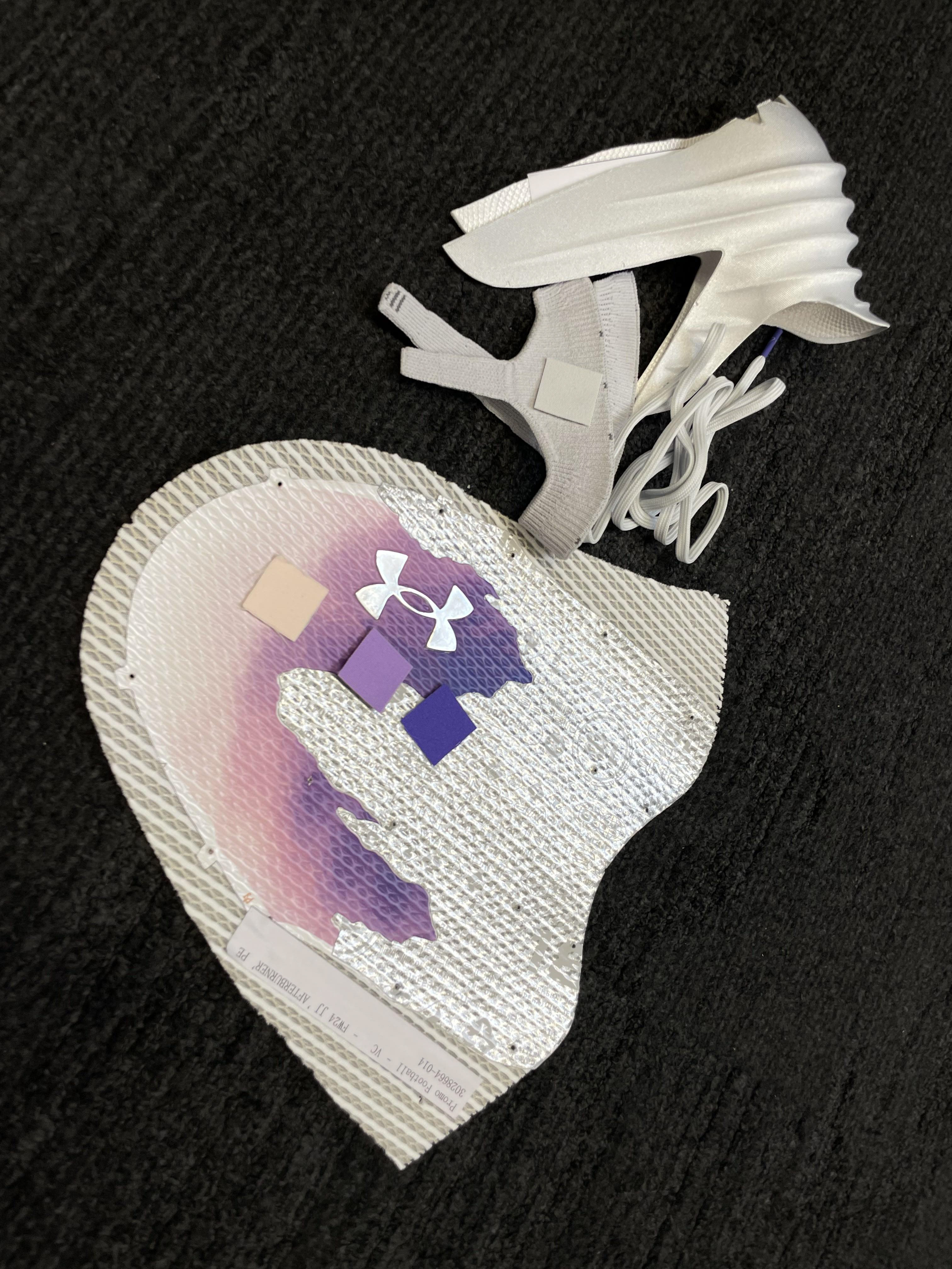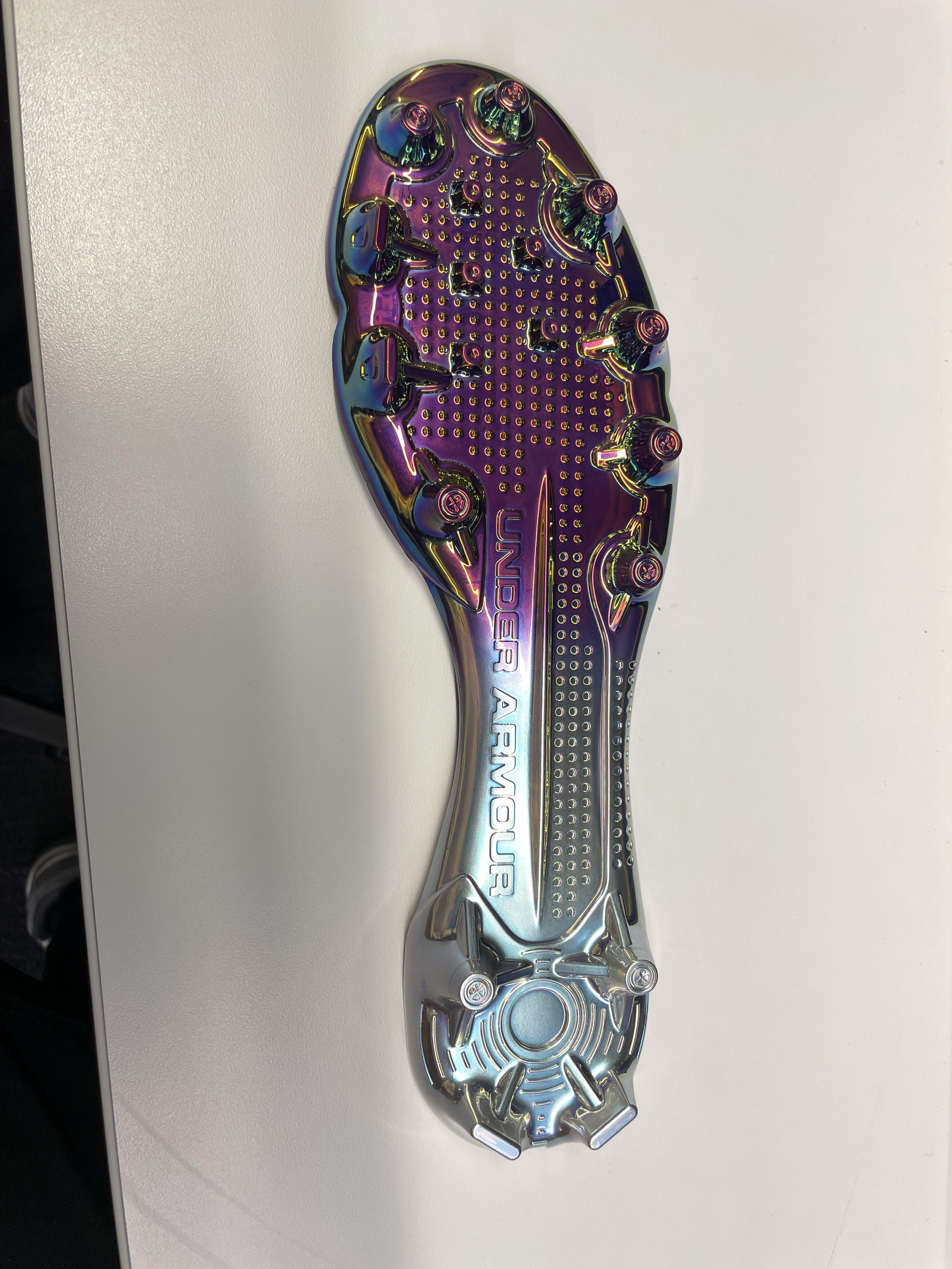 Extended the material story into the rear of the cleat by replacing the standard textile with a satin-like finish. Designed the plate with a purple-to-silver gradient and solar chrome finish, referencing the look of an oxidized exhaust.