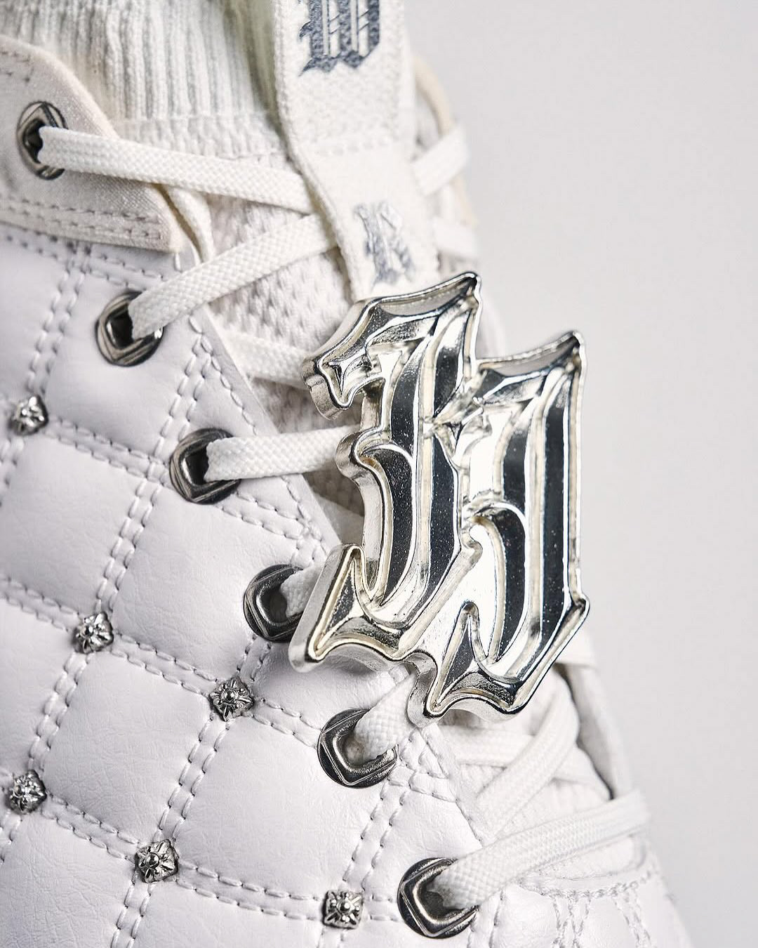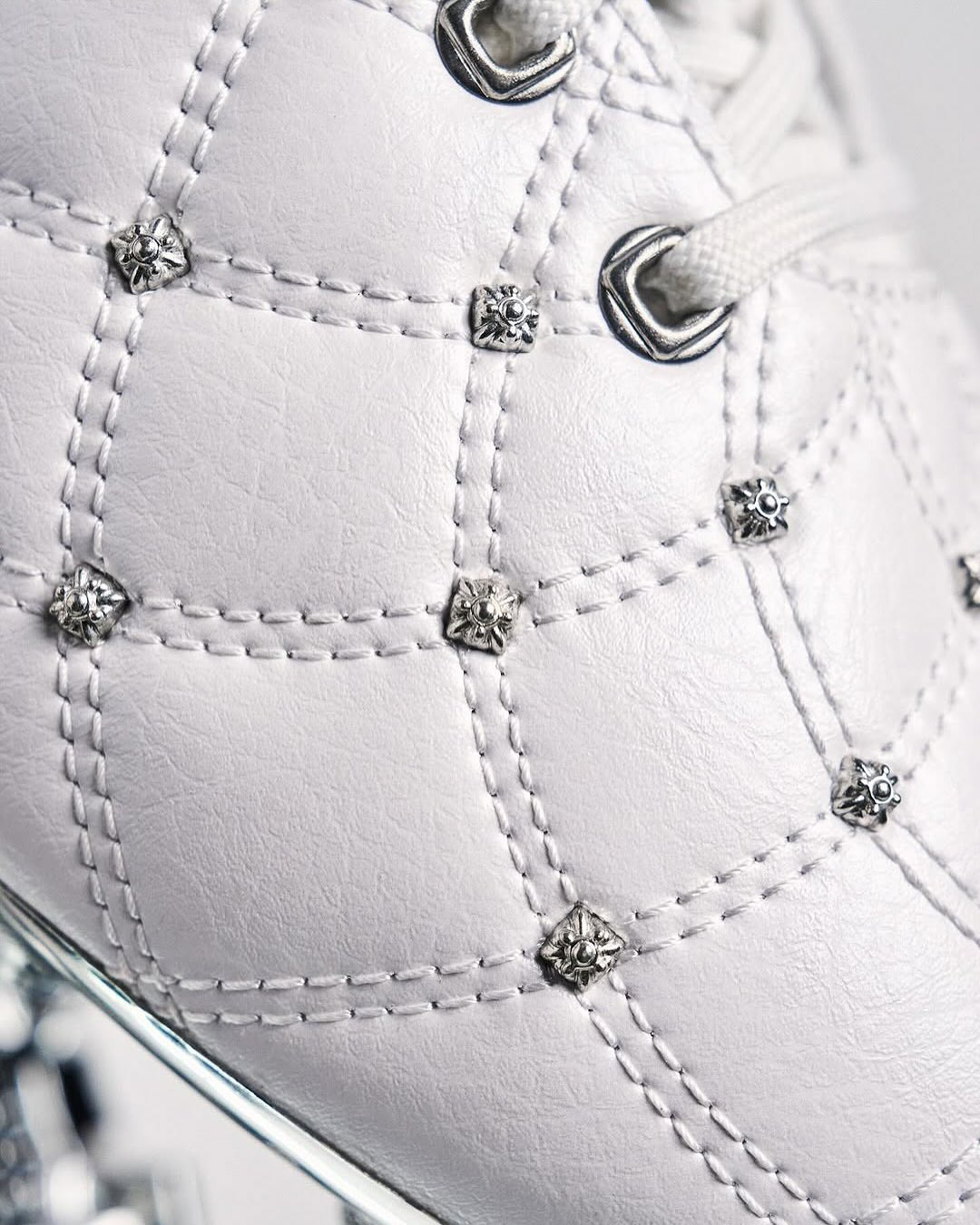 Drew inspiration from Chrome Hearts, particularly its use of leather, metal hardware, and handcrafted detailing. Applied this design language to the Inline Blur model by replacing the standard mesh and TPU film upper with synthetic leather, establishing a more elevated foundation.